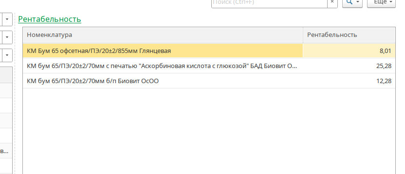 Данная вкладка доступна для работников ПЭО или для тех сотрудников для которых доступна роль «Просмотр рентабельности»