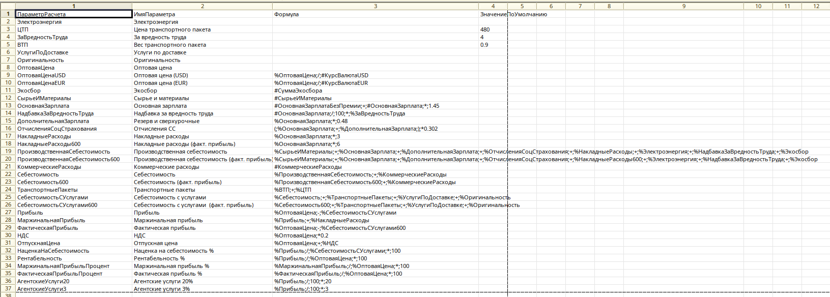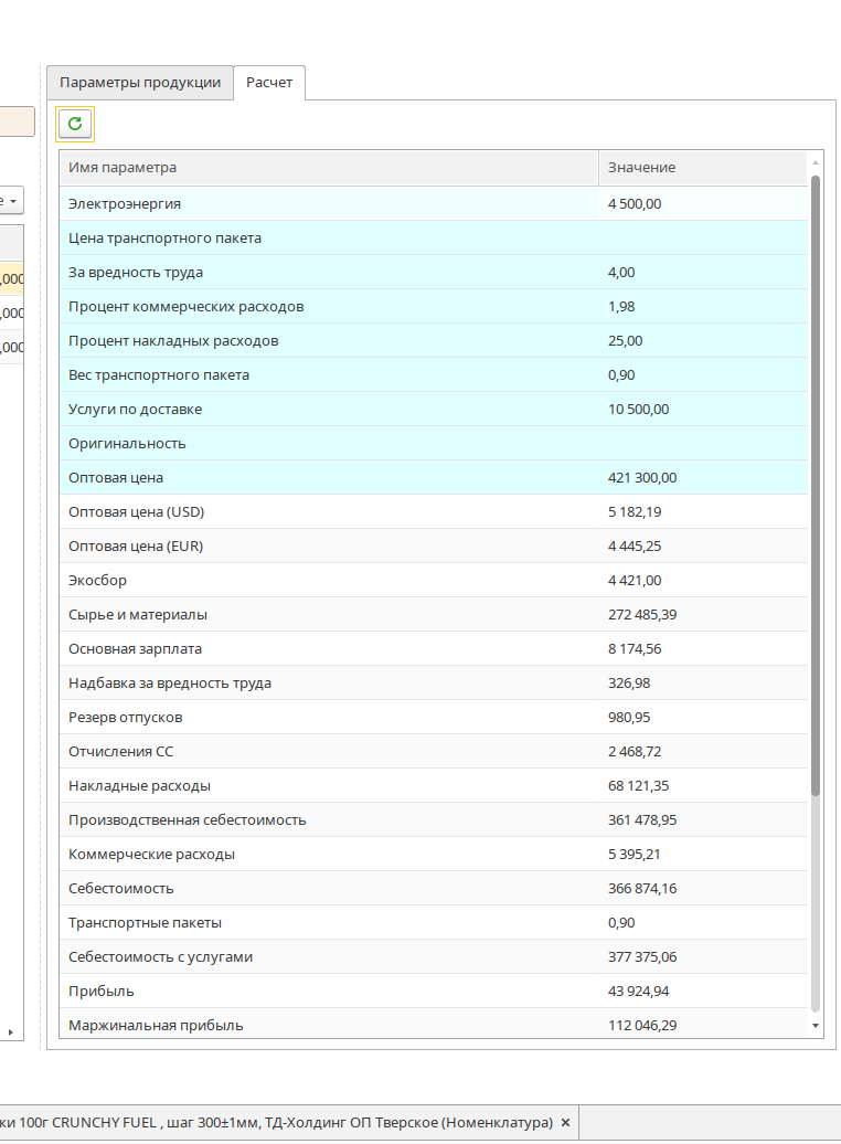 Во вкладке расчет показываются основные стоимостные показатели ассортимента. Считается рентабельность и маржинальная прибыль при выполнении заказа.