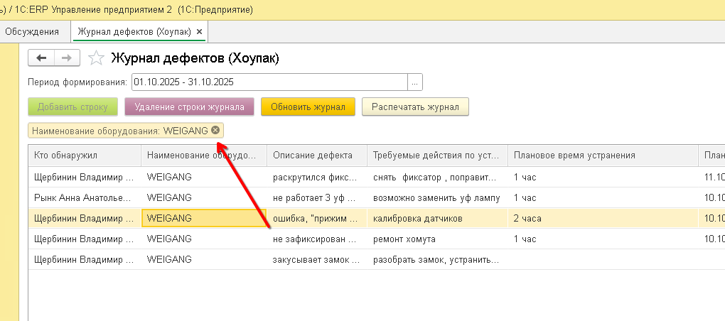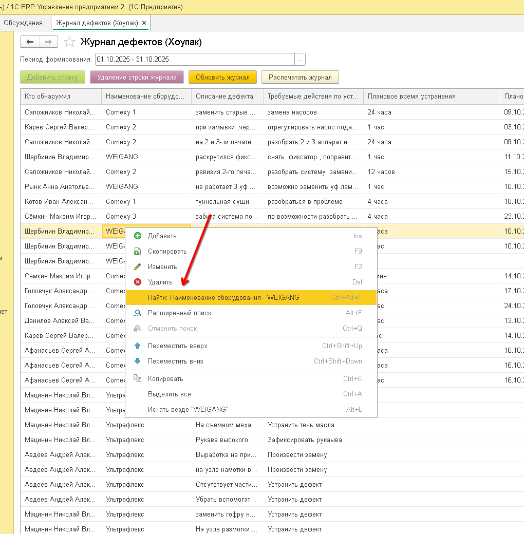 В журнале отображается информация по дефектам, которые были найдены операторами машин.