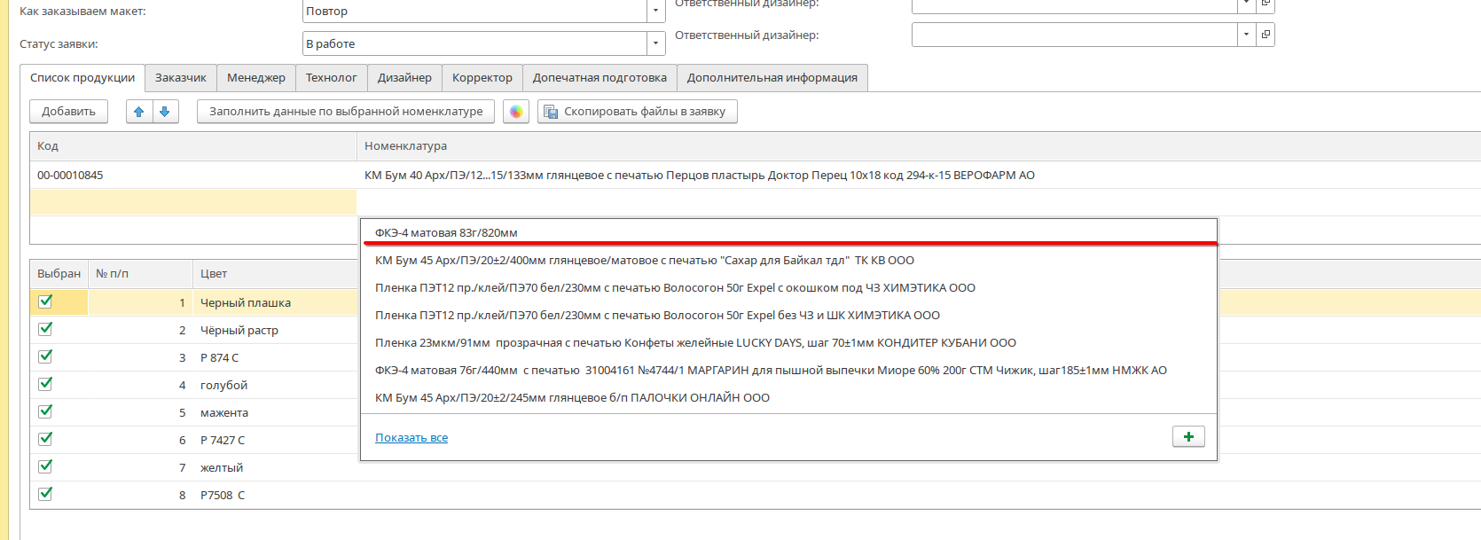 Заходим на вкладку продукция, нажимаем кнопку «Добавить», затем показать всё и из списка выбираем необходимую номенклатуру.