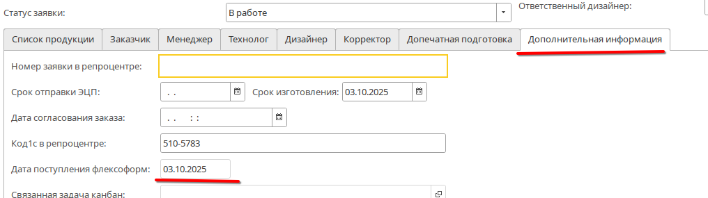 Дату можно просмотреть на вкладке дополнительная информация, поле Дата поступления флексоформ поставить необходимо такую же дату.