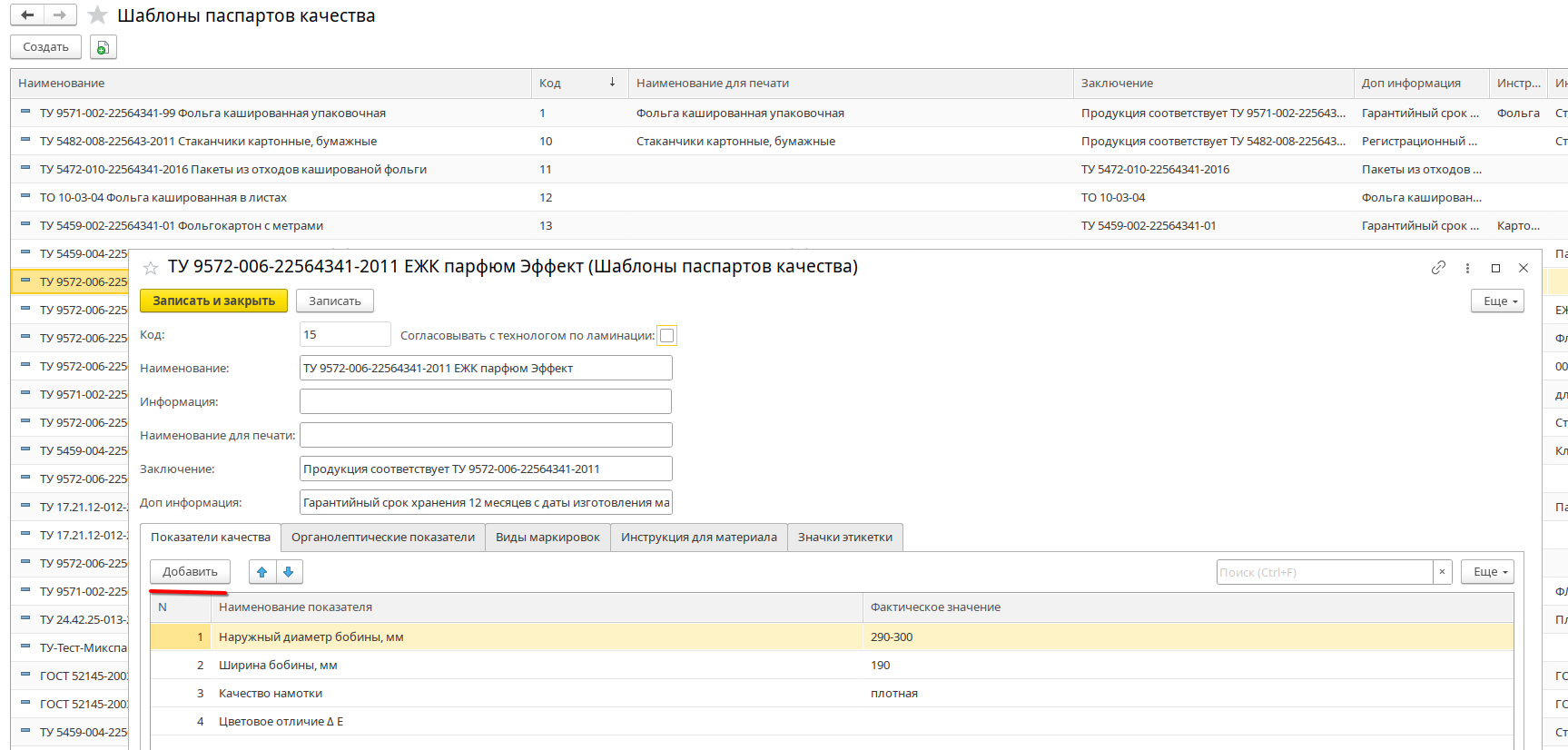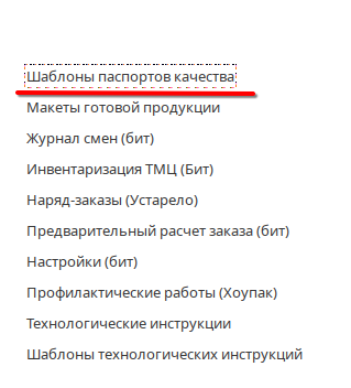 В самом верху списка выбрать пункт меню «Шаблоны паспортов качества»