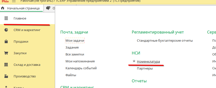 Необходимо зайти в главное, зайти во вкладку номенклатура.