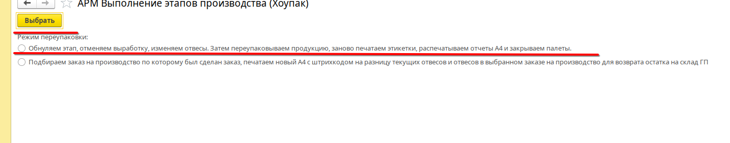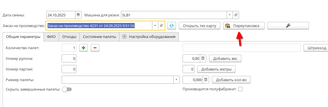 Затем нажать клавишу переупаковка. Поставить точку на первом пункте меню и нажать выбрать. После этого произойдет открытие всех палет связанных с этим этапом.
