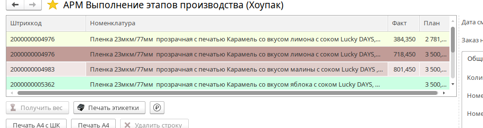В рабочем месте упаковщицы необходимо открыть заказ на производство, выбрать необходимый ассортимент выбрав его нажав левой клавишей мыши на нужную строку.