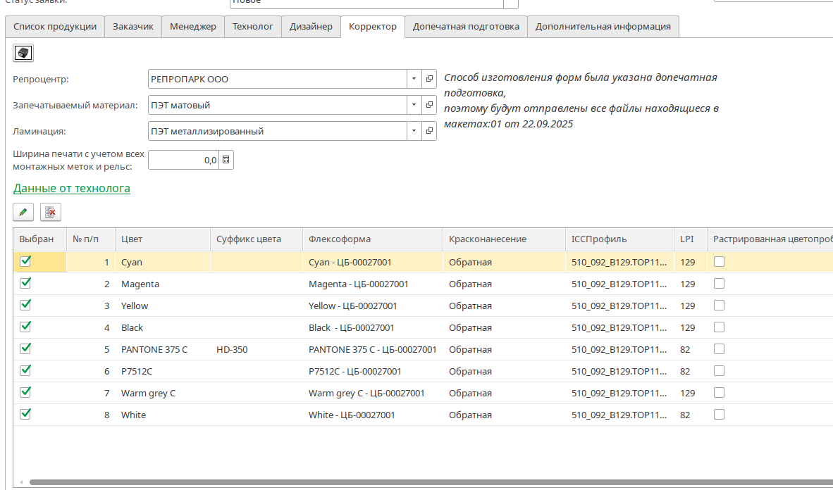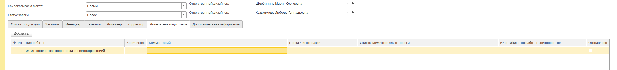 Затем на вкладке корректор добавить вид работ, которую должен сделать репроцентр