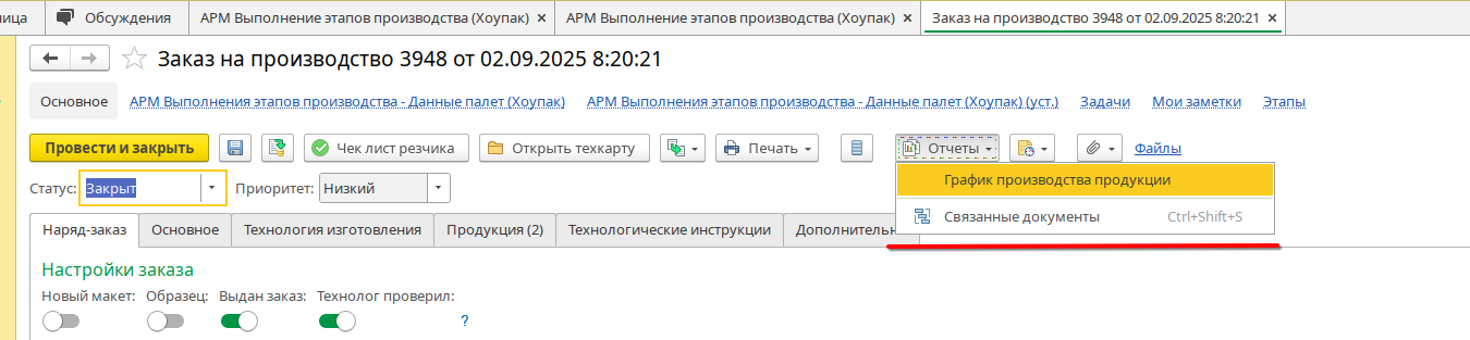 в открывшемся окне нажать «Отчеты» и выбрать пункт меню «Связанные докуметы»