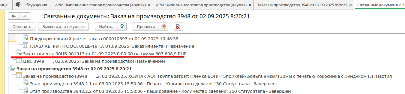 В списке связанных документов найти «Заказ клиента» и открыть его нажав два раза на заказе клиента.