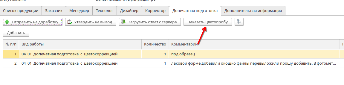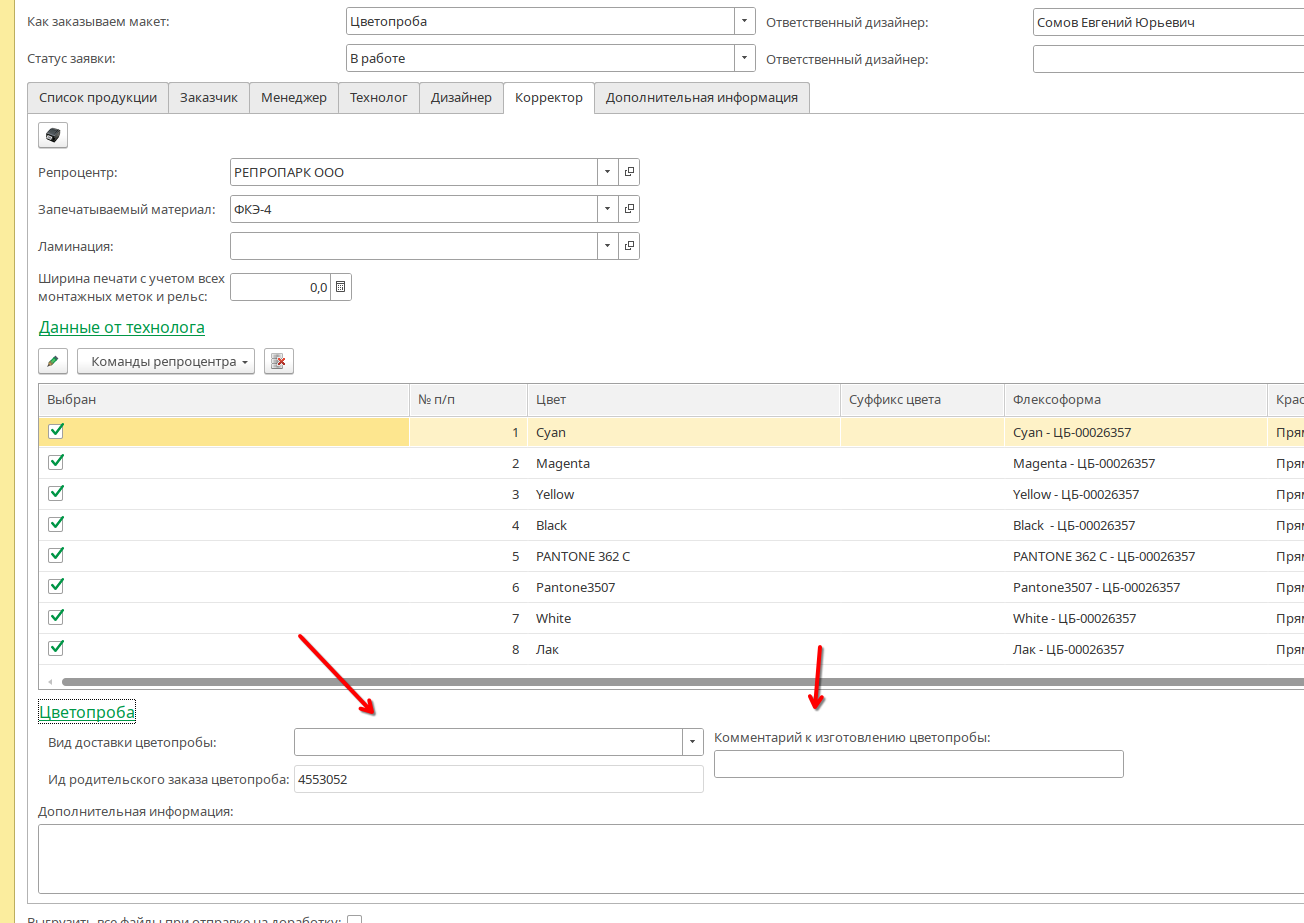 На вкладке корректор можно указать «Вид доставки цветопробы» и «Комментарий» затем необходимо отправить заполненный бланк в репроцентр. Эта заявка идет точно также как обычная заявка на заказ форм.