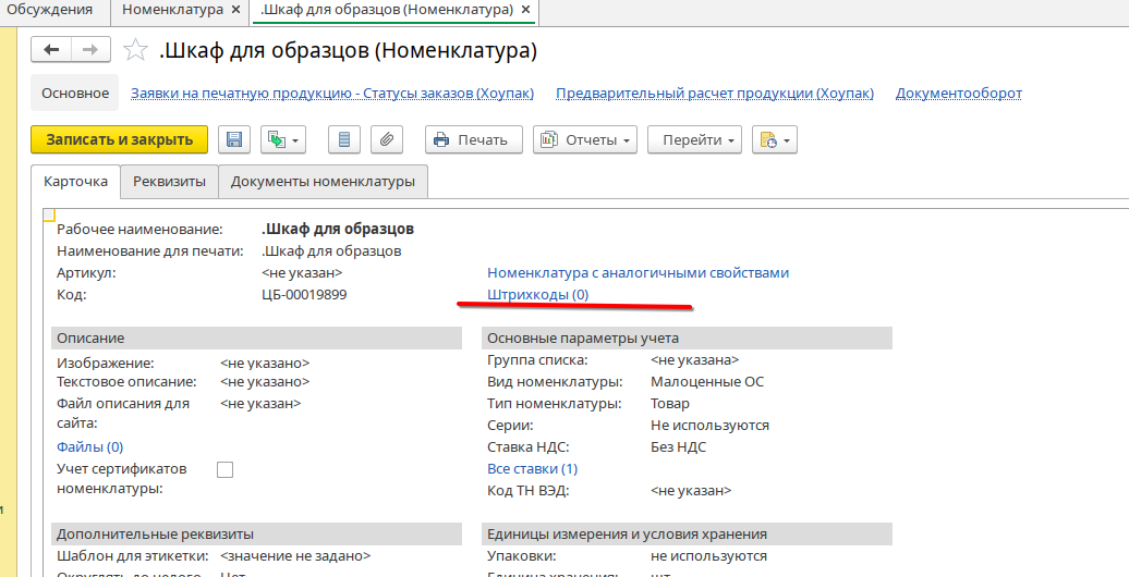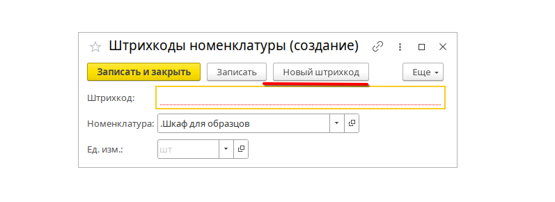 Затем нажать кнопку новый штрихкод, после того как штрихкод создастся, необходимо нажать кнопку записать и закрыть.