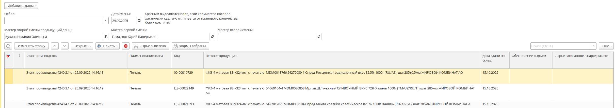Сырье вывезено(Тележка с галочкой) - пометка что сырье для выполнения данного этапа производства было вывезено в цех. При выводе печатной формы «Печать сырья», вывезенное сырье не отображается.
