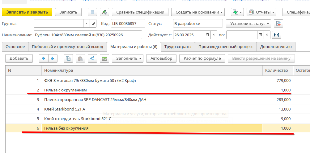 Как это работает. Заведем спецификацию с двумя позициями, гильза с округлением, гильза без округления.