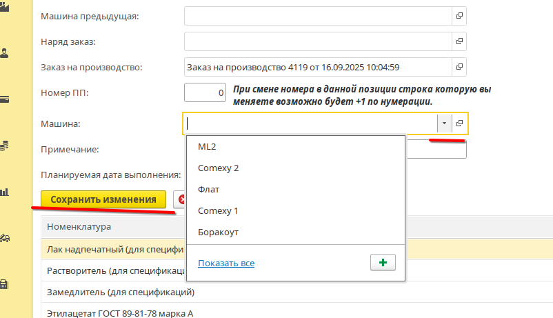 В открывшемся окне необходимо выбрать рабочий центр на котором будет выполнятся данный этап, затем нажать сохранить изменения.