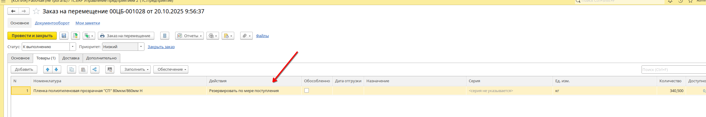 При проведении приходного ордера, заказ на перемещение переходит в статус «Резервировать на складе», а в общем списке статус устанавливается «Готов к отгрузке»