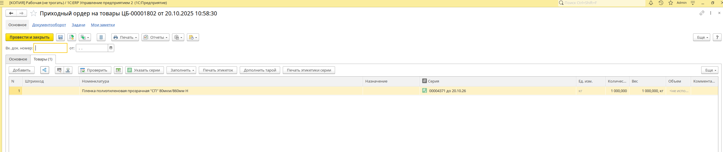 Тем временем кладовщик оприходует товар на складе сырья ордерном.