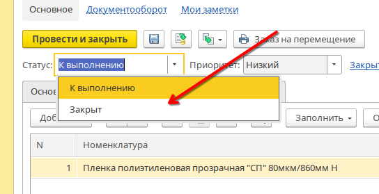 Теперь после того как сырье по заказу будет отгружено в цех, необходимо перевести статус документа в «Закрыт»