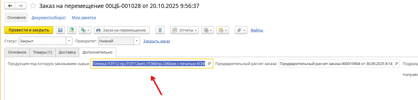 Продукция по которому данный заказ обеспечивается можно посмотреть на вкладке «Дополнительно»