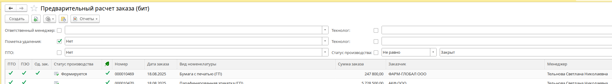 Статус производства - показывает статус в котором находится производство данного заказа - Формируется - ещё не начато выполнение, в производстве - производство начато, закрыт - всё выпущено, производство закончено.