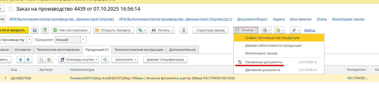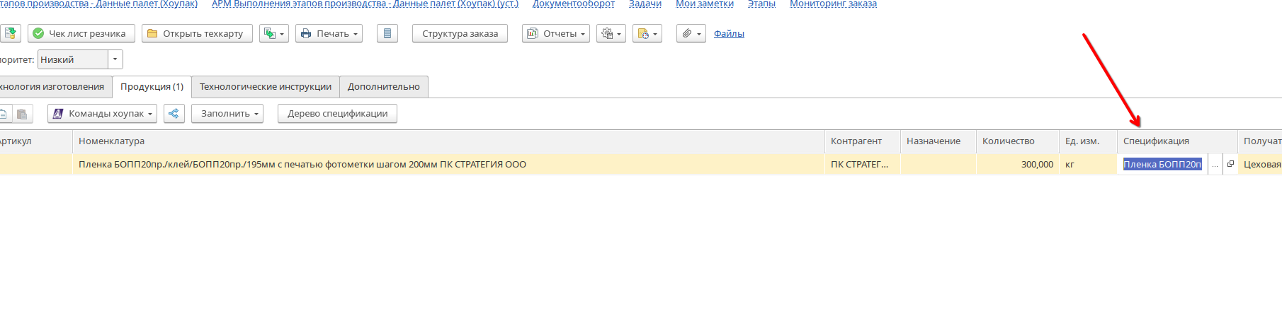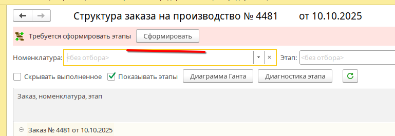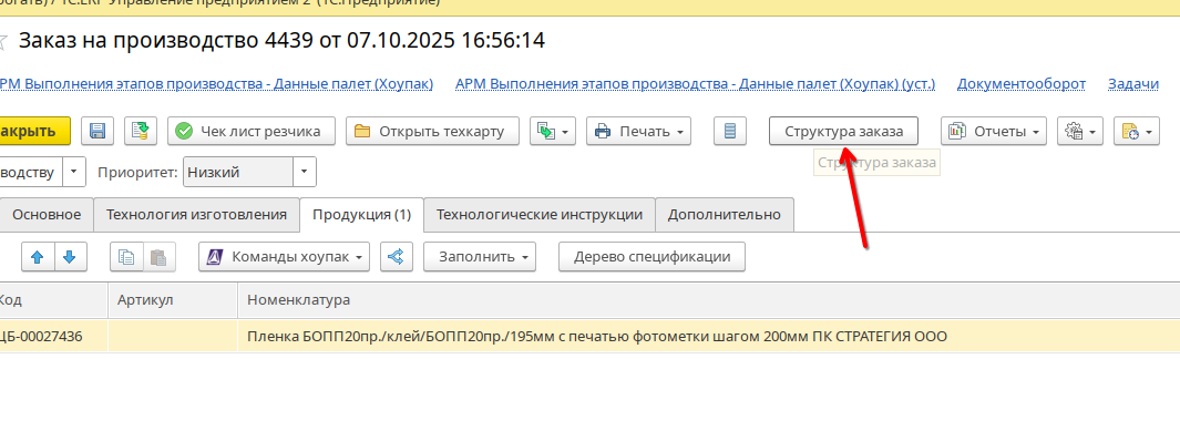 После этого в заказа на производство необходимо перейти в структуру заказа