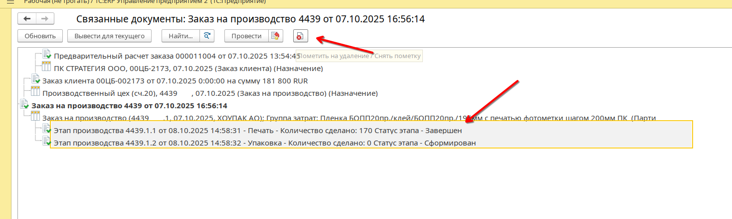 Выделить все этапы производства и нажать на команду пометить на удаление