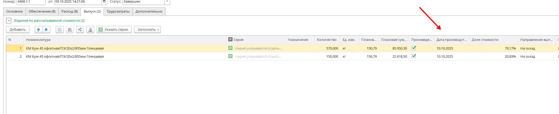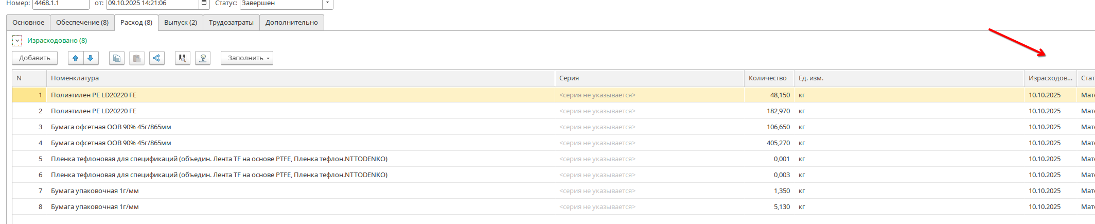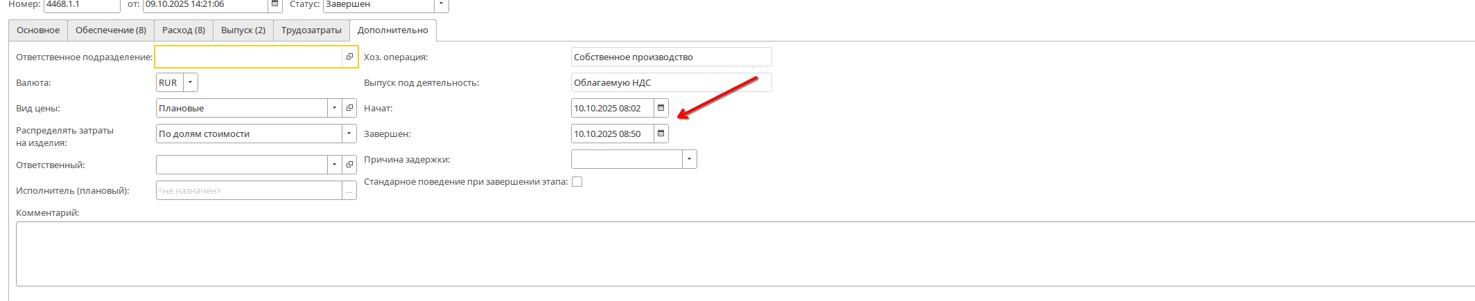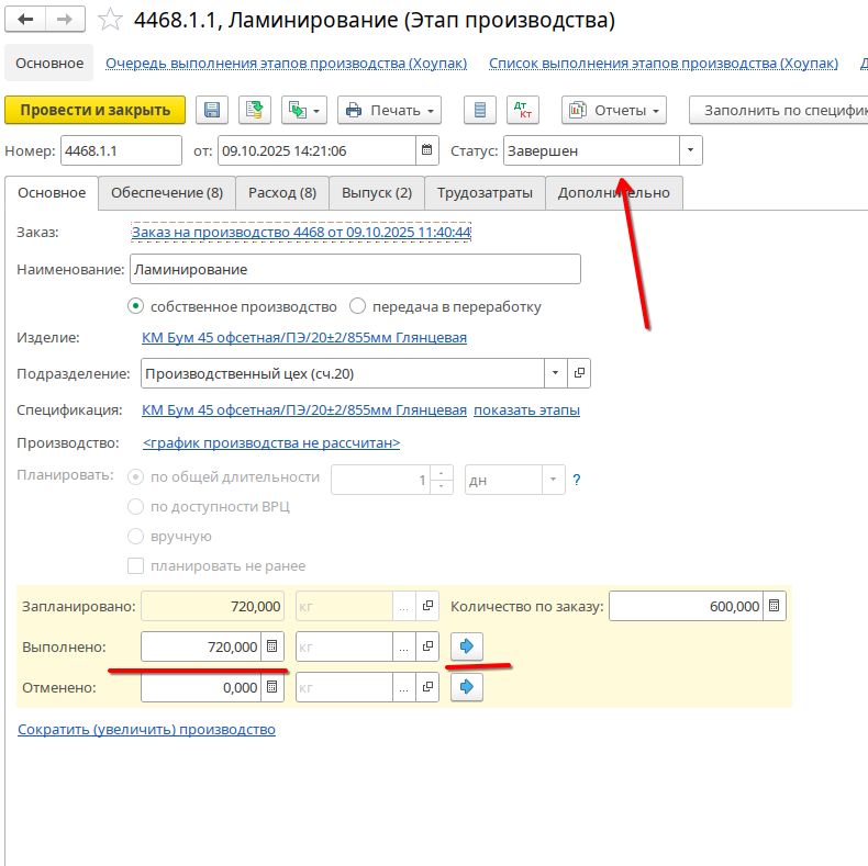 Все этапы которые уже были закончены необходимо провести вручную, для этого необходимо зайти в вновь созданный этап и проставить на вкладке выполнено количество из удаленного этапа. И нажать синюю стрелочку. Если этап был завершен, тогда статус необходимо также перевести в «Завершен»