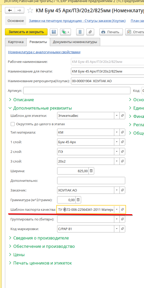 Шаблон паспорта указывается для каждой номенклатуры в карточке.